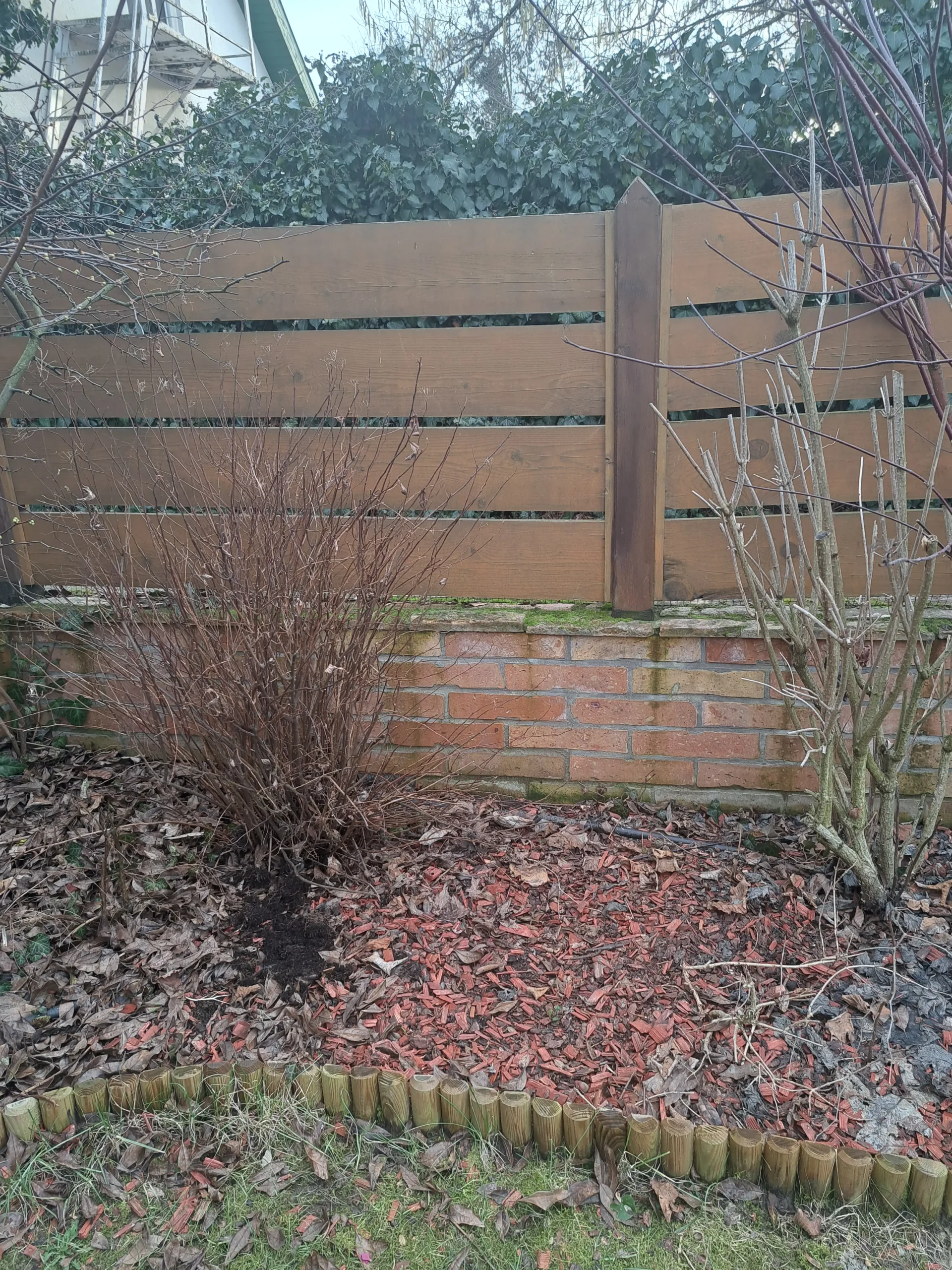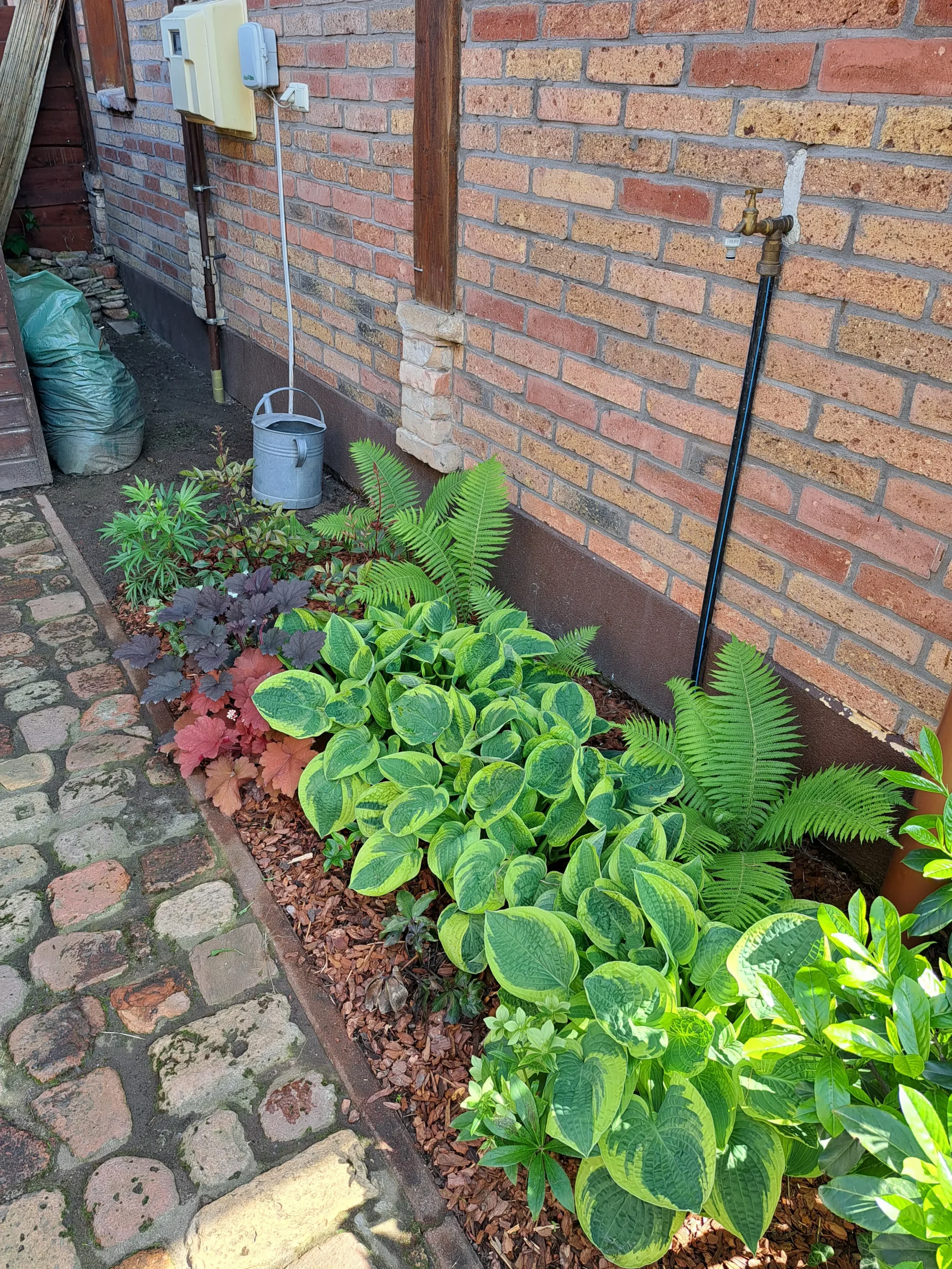 Egy ikerház kis kertjének felfrissítése. Pár cserje alkotta a kiskertet gyeppel a közepén, ágyások megnagyobbítására és új ágyás kialakítására került sor. Virágzó lágyszárú évelőket, futó rózsákat és bugás hortenziát is terveztem a kertbe.